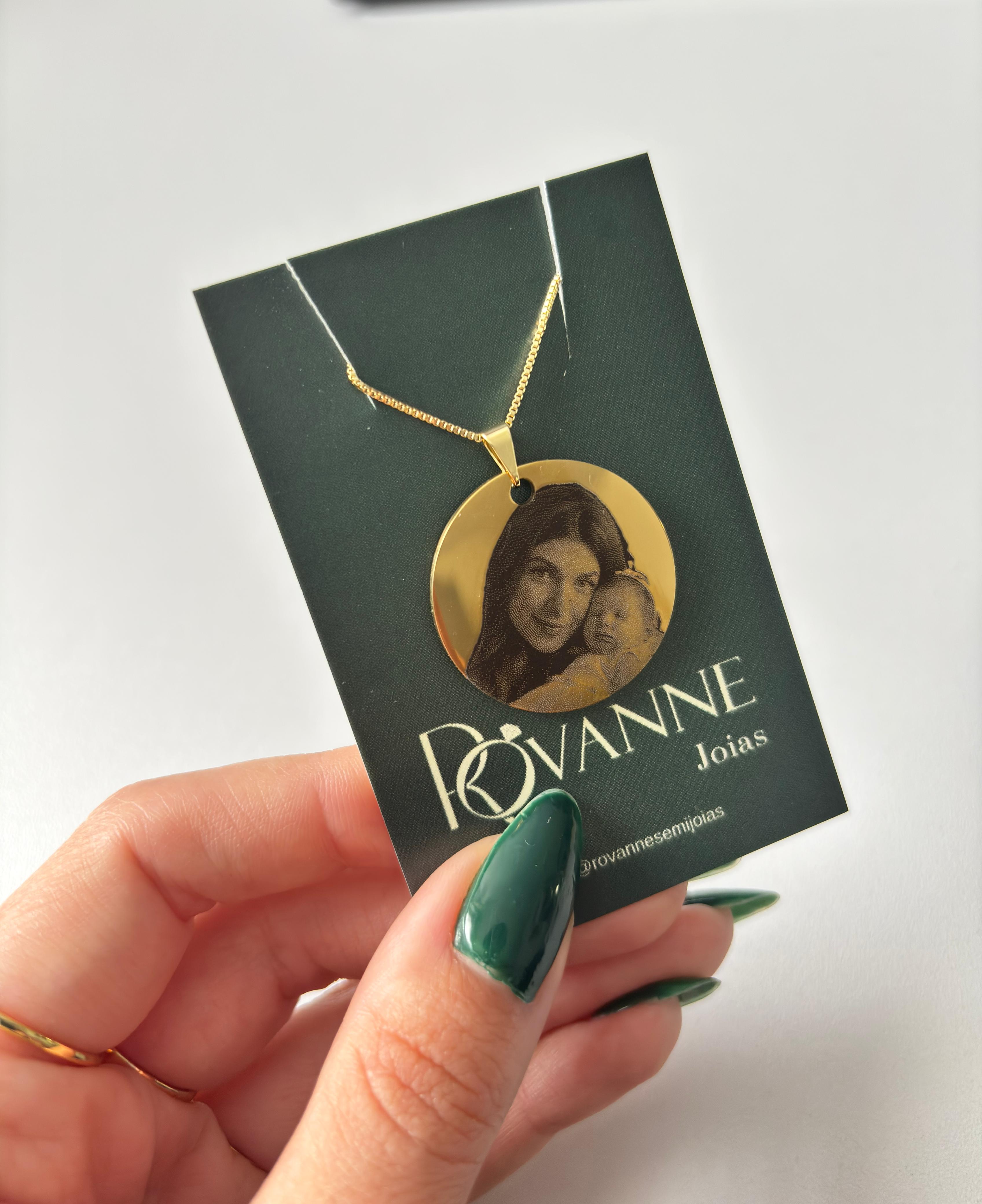 Nosso colar em medalhão redondo permite eternizar uma fotografia gravada a laser em alta definição, transformando lembranças únicas em uma joia exclusiva.